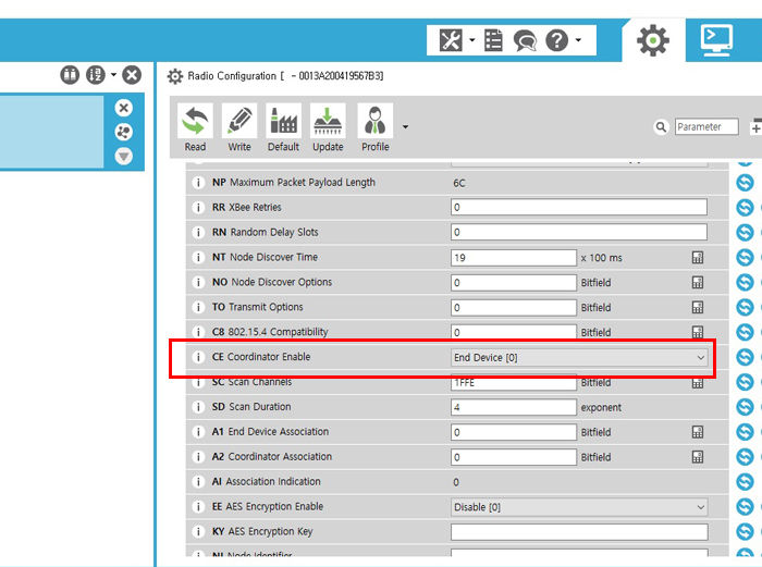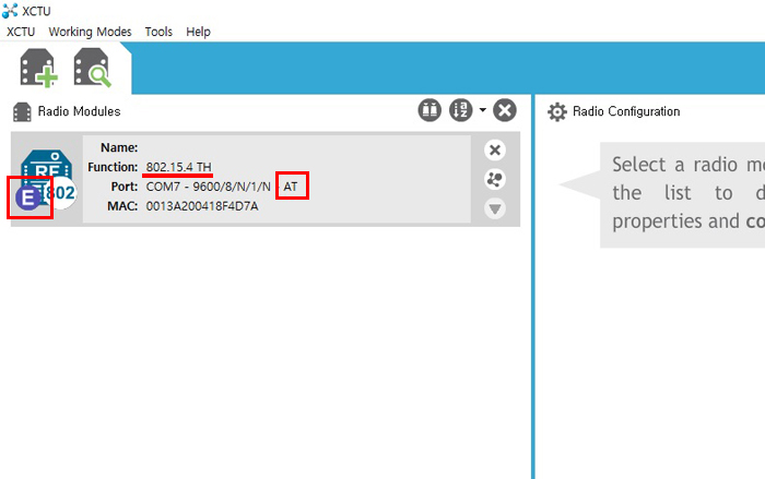 위 처럼 디바이스를 인식 시켜준 다음 XBee를 확인해 보면 End Device 와 AT모드 인것을 확인할 수 있습니다