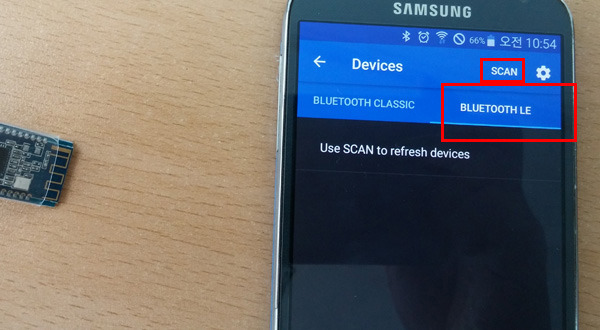 AT-09 는 BLE 모듈 이므로 상단메뉴에서 BLUETOOTH LE 메뉴를 선택하고 바로 위쪽 SCAN 을 눌러 장치를 스캔합니다
