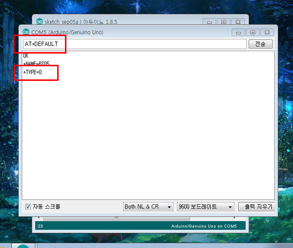 혹시 모르니 입력창에 AT+TYPE을 입력해서 AT+TYPE=0 (비밀번호 없음 페어링으로 잘 되어있는지 확인해 줍니다)
