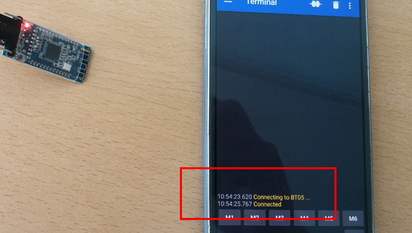 페어링이 성공하면 Connected 메시지가 나옵니다 (AT+TYPE=0 세팅이므로 비밀번호 입력 없이 페어링 됩니다)
