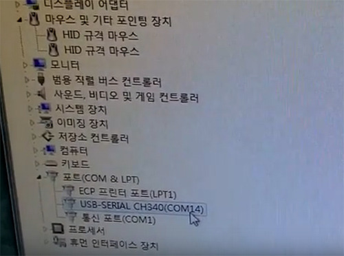 드라이버 설치가 끝나고 보드를 마이크로 USB케이블로 연결하면 PC의 장치관리자에 CH340 로 COM포트가 확인됩니다