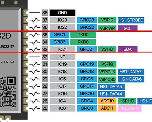 ESP32 모듈의 핀맵을 확인하면 D21이 SDA, D22가 SCL 핀임을 알수 있습니다
