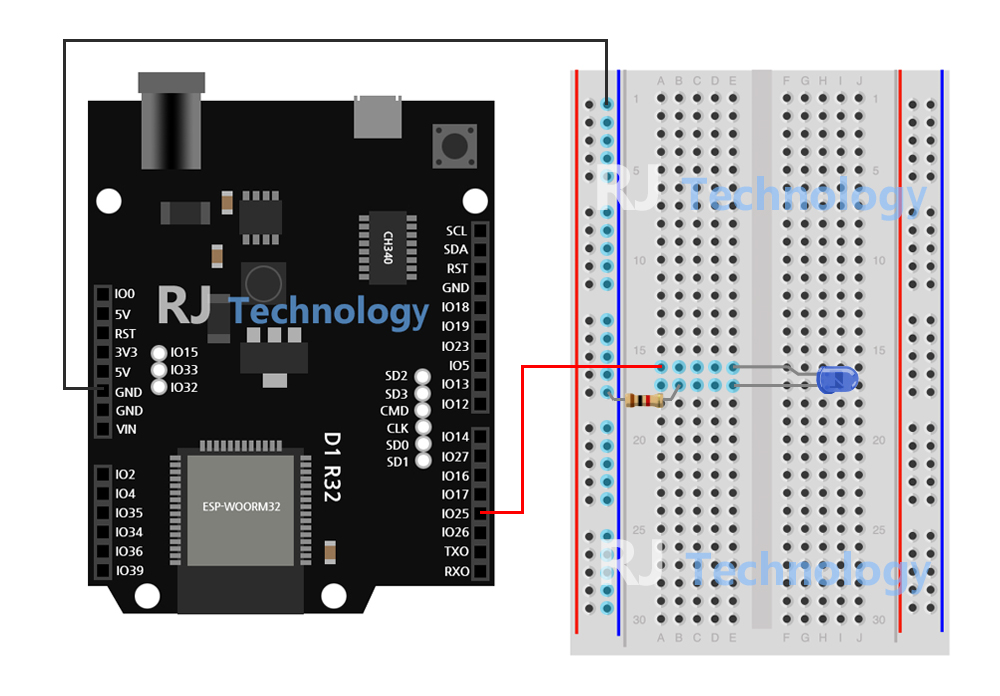 위 첨부된 "ESP32 Blink_LED" 예제는 브래드 보드에 배선 된 LED를 깜박이게 하는 예제입니다